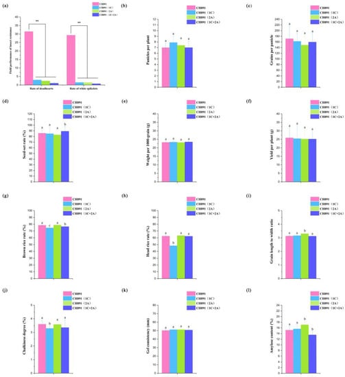 Comparison of a recurrent parent (CH891) with CH891(1C), CH891(2A), and CH891(1C+2A) transgenic restorer lines that resistance to C. suppressalis, and agronomic traits, respectively. (a). The reaction of the three transgenic restorer lines and their parent on insect larvae damage under natural infestation at the tillering and heading stage in Nanchang field (E115.5°, N28.5°), China. (b–l). Bar charts of the 12 agronomic and end-use quality traits recorded in three transgenic lines and their recurrent parent. The phenotype data were based on one environment. The bars indicate the standard deviations, and the median horizontal line indicates the mean. See Table S9 for Pairwise comparisons. Data of each test were analyzed by one-way ANOVA (** p < 0.01). Data followed by different lower-case letters denote significant differences between agronomic traits at the 5% level according to LSD test.