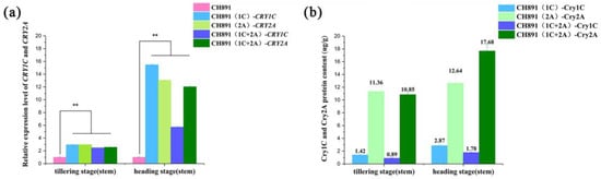 Comparison of a recurrent parent (CH891) with CH891(1C), CH891(2A), and CH891(1C+2A) transgenic restorer lines that consisted of CRY1C, CRY2A, and both CRY1C/CRY2A genes, respectively. (a). Relative gene expression levels of CRY1C and CRY2A based on qRT-PCR. (b). Cry1C and Cry2A protein content was detected by enzyme-linked immunosorbent assay (ELISA). Data of each test were analyzed by one-way ANOVA (** p < 0.01).