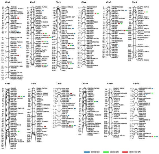 The chromosomal distributions of the 512 microsatellite markers used for genotyping CH891(1C), CH891(2A), CH891(1C+2A), and CH891. Blue, green, and red bars represent the homozygous markers for Minghui 63 genome and/or the Bt genes in three restored lines [CH891(1C), CH891(2A), and CH891(1C+2A)], respectively; the remaining markers were homozygous for the CH891 genome. The scale on the left indicates the physical positions (Mb) of each marker, while the right side of the map shows the name of the microsatellite markers.