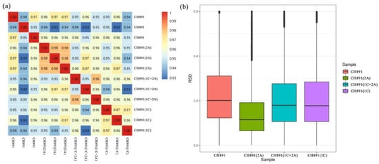 (a) Correlation coefficients and (b) box plots of protein expression levels of leaf samples of three transgenic lines and their recurrent parent collected at the heading stage. Each line was represented by three biological replicates. RSD (relative standard deviation), boxplot of RSD of quantitative protein values between repeated samples. The smaller the overall RSD value, the better the quantitative repeatability.