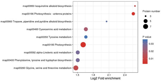 KEGG enrichment analysis of differentially expressed proteins (DEPs). KEGG enrichment analysis was performed for each protein class by Fisher’s exact test method, and the enrichment results for different classifications were combined. Then, the top 40 (p < 0.05) significantly enriched functional classifications were identified. The horizontal axis shows fold enrichment after Log2 transformation, the vertical axis shows the functional classification, the bubble size represents the number of proteins, and the bubble color represents the value of p of enrichment significance.