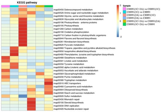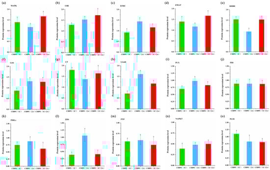Parallel reaction monitoring (PRM) of proteins involved in the COG enrichment pathways by three transgenic events. Samples were obtained from leaves at the heading stage in CH891(1C), CH891(2A), and CH891(1C+2A). (a–o) represents PRM results of key enzymes MAPK, UBE, EFHC, SHMT, PPI, GSS, CF, UG6D, PUX, PDI, PIRLs, ZDS, PTP, NAPKT, and PGM, respectively. Relative protein rates of each sample were compared to those in CH891. The data are means of three biological replicates; different letters indicate significant differences within NIL groups (p < 0.05), and bars between columns indicate significant differences among proteins among NIL groups. Data followed by different lower-case letters denote significant differences between relative protein rates of each sample at the 5% level according to LSD test.