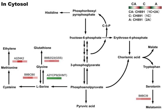 Changes in quantified proteins associated with the glycine, serine, and threonine metabolism pathways in three transgenic lines (NIL groups) and control lines (left box: CH891(1C+2A)/CH891, center box: CH891(1C)/CH891, right box: CH891(2A)/CH891).