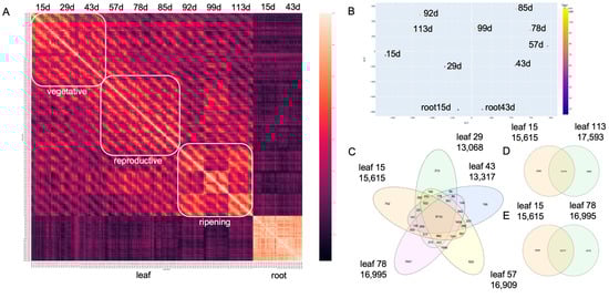 Consistent with the lower number of genes cycling in the roots, the leaf and root expression was poorly correlated in contrast to most leaf samples (Figure 1A and Figure S4). Looking at the samples in a multi-dimensional scaling (MDS) plot, revealed that the leaf samples followed a circular progression suggesting early vegetative phases (15 and 29 d) were most similar to the ripening phase (113 and 92 d) (Figure 1B). Both day length and temperature vary over the developmental time course, and temperature is relatively similar between 15 d and 113 d, which could be influencing the circular MDS plot (Figure S2). Root samples were set apart consistent with the correlation plot yet proximal to the same developmental time as the leaf samples. In general, there was a high overlap between the genes that cycle per condition as evidenced for the first five developmental times, yet there were many genes that are specific as well (Figure 1C and Figure S5). Since 15 and 78 d were the furthest apart of the MDS plot, compared to 113 d, it seemed there should be a large difference in the genes that cycled between the three conditions, yet there was a similar overlap in cycling genes (Figure 1D,E). Therefore, since a high overlap between conditions was observed, it could be that phase, or expression TOD, was driving the relationships between time courses.