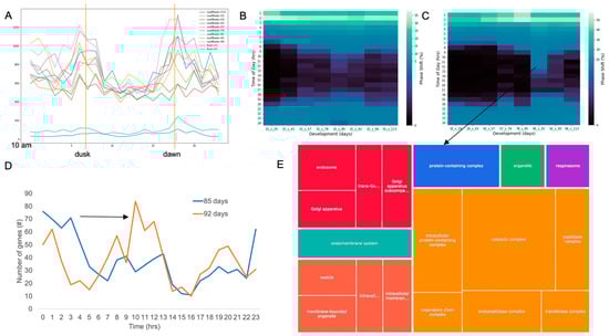 Figure 2. Global phase shifts associated with developmental timing. (A) Number of genes with specific time of day (TOD) expression across the eleven time courses. The time courses all started at 10 am, so relative dusk and dawn were marked; (B) relative phase shift compared to the first time course at 15 d with hrs shifted on the y-axis and the comparison time courses on the x-axis; (C) incremental phase shift comparing each proximal time courses with hrs shifted on the y-axis and the comparison time courses on the x-axis; (D) The phase shift of the genes from the incremental phase analysis between 85 and 92 d that showed a predominant shift from afternoon to mid-evening expression; (E) The significant gene ontology (GO) terms for the genes displaying the phase shift from the incremental phase analysis between 85 and 92 d; colors are arbitrarily assigned to GO terms with similar classifications.