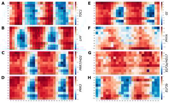 42. Strayer, C.; Oyama, T.; Schultz, T.F.; Raman, R.; Somers, D.E.; Más, P.; Panda, S.; Kreps, J.A.; Kay, S.A. Cloning of the Arabidopsis Clock Gene TOC1, an Autoregulatory Response Regulator Homolog. Science 2000, 289, 768–771. [Google Scholar] [CrossRef] [PubMed]