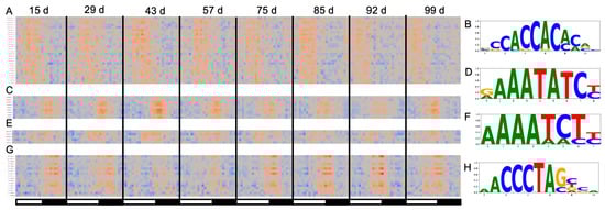 Figure 4. Element analysis across the developmental time course. (A) The Morning Element (ME; CCACAC) displayed morning-specific overrepresentation; (B) the logo plot of the significant ME 3–8 bp kmers found in (A); (C) the Evening Element (EE; AAATATCT) displayed evening/dusk-specific overrepresentation; (D) the logo plot of the significant ME 3–8 bp kmers found in (C); (E) the CCA1 Binding Site (CBS; AAAATCT) displayed evening/dusk-specific overrepresentation; (F) the logo plot of the significant ME 3–8 mers found in (E); (G) the Telobox (TBX; AAACCCT) displayed midnight-specific overrepresentation; (H) the logo plot of the significant ME 3–8 bp kmers found in (G). The white and black bars represent relative day and night, respectively.