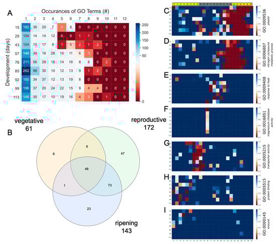Figure 5. Gene ontology (GO) terms across the developmental time course. (A) Summary of the number of significant (p < 0.05) across the developmental time course and the number of times they are significant across each time course; (B) overlap of the GO terms across the vegetative, reproductive and ripening phases reveals 46 terms that are shared; significance plotted by TOD across the developmental time course for: (C) plastid (GO:0009532); (D) nitrogen compound metabolic process (GO:0006807); (E) response to heat (GO:0009408); (F) magnesium chelatase activity (GO:0016851); (G) transporter activity (GO:0005215); (H) protein binding (GO:0005515); (I) exocyst (GO:0000145). Green, more significant; red, less significant/non-significant.