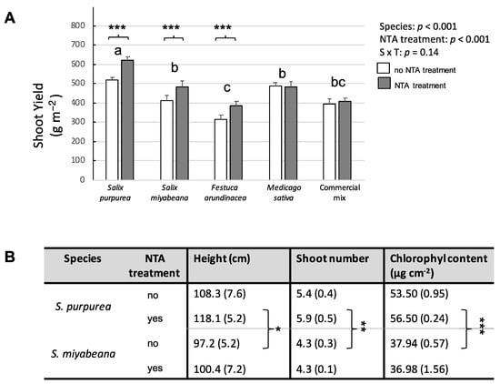 Figure 1. Establishment of tested species on Zn-contaminated soil without/with the addition of NTA as a chelating agent. (A) Aboveground yield. White bars represent plants growing in Zn-contaminated soil not treated with NTA; grey bars represent plants growing in Zn-contaminated soil treated with NTA. Values are means ± SE. There was no interaction between the two factors plant species × soil treatment; different letters indicate significant differences (Tukey HSD; n = 10 between plant species); asterisks indicate a significant effect of NTA treatment (Student’s t-test; n = 5). (B) Growth and physiological parameters of Salix purpurea and Salix miyabeana. Plant height (cm), shoot number, and chlorophyll content (µg cm−2) were recorded at the end of the experiment for the two tested willow species. For all parameters, there was no interaction between the two factors ‘plant species’ × ‘soil treatment; the ‘plant species’ factor, but not ‘NTA treatment’, affected height, shoot number, and chlorophyll content. Asterisks indicate significant differences between species (Student’s t-test, * p < 0.05, ** p < 0.01 and *** p < 0.001 for height, shoot number, and chlorophyll content, respectively; n = 10). Values are means ± SE, ns = non-significant.