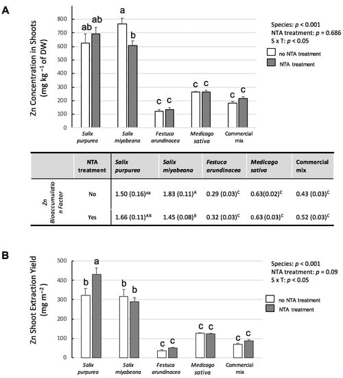 Regarding the plants’ Zn concentrations, there was an interaction between the two factors plant species × soil treatment (Figure 2A, p-value = 0.05). The concentration of Zn in the willow shoots indicated a Bioconcentration Factor (BCF) > 1.5; this was three times more concentrated than in the shoots of M. sativa (BCF = 0.5) or in those of the commercial mix (BCF = 0.6) and up to five times more than in F. arundinacea’s aboveground tissues (compare 765 mg kg−1 to 122 mg kg−1 of dry matter), for which the Zn was concentration was the lowest (BCF = 0.3). The NTA amendment negatively affected the Zn concentration in S. miyabeana’s aboveground biomass; no significant changes were observed for the other species.