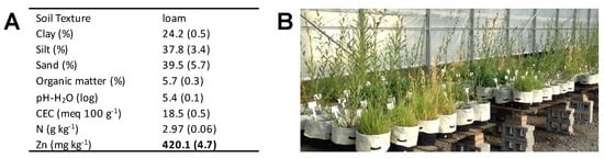 Figure 3. Phytoremediation experiment concerning Zn-contaminated soil excavated from an area polluted by a freight train derailment and spill incident (A) Soil’s initial physical and chemical characteristics. Values are the mean ± SE (n = 5). Numbers in bold exceed Canadian criteria of trace element soil concentration for residential land use. CEC = cation exchange capacity; (B) Partial view of the open greenhouse experiment after 90 days of growth.
