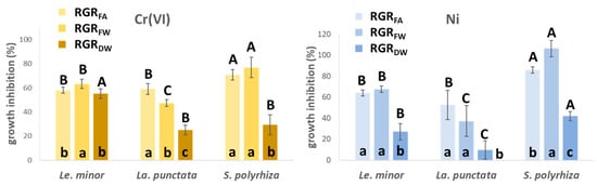 Cr(VI)- (left), and Ni-induced inhibition (right) of relative growth rates (RGR) derived from different growth parameters (frond area—FA, fresh weight—FW, dry weight—DW). The inhibition was compared to the respective species-specific control growth rates. Means ± SD of n = 6 samples; different lower cases at the bottom of bars denote significantly different (p < 0.05) inhibition of growth parameters with respect to the given species (Le. minor, La. punctata or S. polyrhiza) and treatment, while different capitals on top of the bars indicate significantly different (p < 0.05) growth inhibition of species based on the same growth parameter.