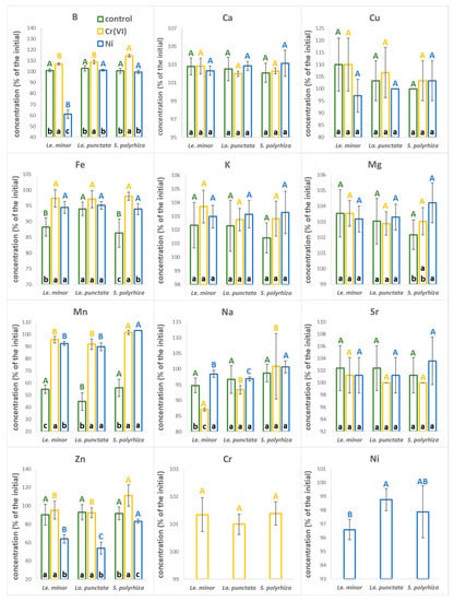 In general, the concentrations of most analyzed elements in the medium did not change much under control (no metal supplementation) conditions over the test duration (Figure 2, the actual concentrations are supplemented in Table S3). However, a substantial drop was found in the concentration of Mn, which had decreased by 44% (S. polyrhiza), 45% (Le. minor), and 55% (La. punctata) by the end of tests (Figure 2). In Cr(VI) treatments, the medium composition changed even less compared to that of the control (Figure 2). In fact, the concentration of most elements (B, Ca, Cu, K, Mg, and Sr) slightly increased, probably due to the evaporative loss. Similarly, chromium level stayed similar (101%) to its original concentration (Table S3). In Ni treatments, the concentration of B in the medium decreased strongly in the case of Le minor (−39%), while it stayed unchanged (99–101%) in case of the other two species (Figure 2). The other element that showed considerable depletion was Zn with a 27% (S. polyrhiza) to 46% (La. punctata) decrease in concentration compared to the initial content. The concentration of the supplied Ni decreased only marginally (by 2–3%) by the end of treatments (Table S3).