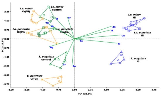 According to the multi-elemental analysis, the first two principal components covered 55.4% of the overall variance in the ionomic dataset (Figure 3, the actual concentrations in the biomass and the comparative statistics are supplemented in Table S4). PC1 correlated strongly with Ni contents. Besides Ni, high positive correlations of this principal component were also found for B, Cu, and Zn (Table S5). Mg, Mn, and Na, in contrast, showed a weak negative correlation with PC1. Cr content of the biomass correlated positively with PC2, similarly to K (Figure 3). Ca and Sr, on the other hand, had negative correlations with that principal component (Table S5). The three studied duckweed species were also mostly separated along PC2 (Figure 3). This distribution suggests that genotype-specific differences in the biomass composition can be hypothesized even in these closely related species. From that aspect, Le. minor can be characterized as having higher K and Na contents than La. punctata and especially S. polyrhiza (Table S5). The latter species, on the other hand, had higher Ca and Sr contents. Being chemical analogues, the more efficient Ca uptake by S. polyrhiza compared to La. punctata and Le. minor can explain the higher Sr content in the biomass of this species as well [].