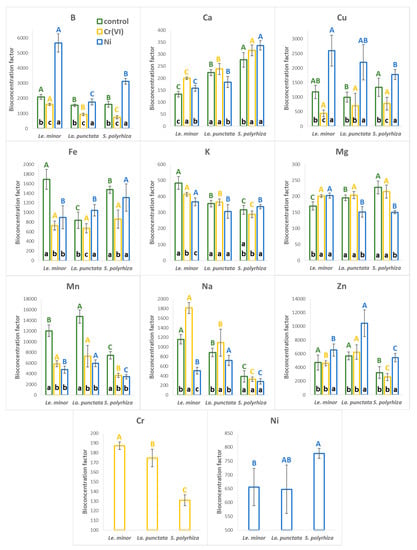 The calculated bioconcentration factors of the analyzed elements under control (green), Cr(VI) (orange), and Ni treatments (blue), in the three duckweed species. Means ± SD of n = 6 samples are shown. Different capitals with corresponding colors indicate significantly different (p < 0.05) medians of species across the same treatment. Different lower cases in the bottom of bars indicate significantly different (p < 0.05) medians of different treatments in case of the same species. Note: Results for Sr are not presented because the concentration of this element was below the detection limit in several samples. The original elemental concentrations have been supplemented in Table S4.