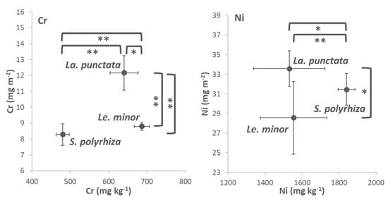 Cr (left) and Ni (right) contents in the biomass of the three tested duckweed species, expressed on dry weight- (x-axes) and area basis (y-axes). Means ± SD of n = 6 samples are shown. Asterisks denote significant differences between the respective species at * p < 0.05 and ** p < 0.01 probability levels according to the performed Kruskal–Wallis test and post hoc Mann–Whitney comparisons.