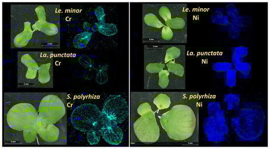 The obtained elemental maps show that μXRF is suitable for the study of internal translocation and distribution of various metals in duckweeds (Figure 6). Considering the popularity of these plants in impact studies and water reclamation, this method may offer a better understanding of the interactions between the duckweed frond and its environment. The μXRF elemental maps revealed that the two metals studied distributed differently within the fronds. Cr primarily accumulated in the veins; the nodes contained particularly large amounts of this metal in all three species (Figure 6). Besides that, frond margins were areas of enhanced Cr accumulation too, especially in Le. minor and S. polyrhiza. In addition, it should be noted that in these two species, the mesophyll also contained detectable amounts of Cr. This was especially the case in Le. minor. In La. punctata, on the other hand, Cr accumulation was almost exclusively limited to the vascular tissues and the frond edges (Figure 6). In contrast with Cr, Ni distributed rather evenly in the mesophyll of fronds, with slightly higher concentrations in the frond margins. In S. polyrhiza, the node also contained a higher concentration of Ni. In Le. minor and La. punctata, on the other hand, basal regions of fronds, especially those of daughter fronds, contained elevated Ni contents (Figure 6).