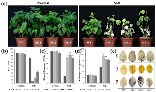 Phenotypic and physiological analyses of the WT plants and lncRNA77580-OE transgenic soybean under salt stress. (a) Phenotypes of overall plants and (b) relative water content, (c) chlorophyll content, (d) electrolyte leakage rate, and (e) trypan blue, DAB, and NBT staining of the leaves of the WT plants and lncRNA77580-OE transgenic soybean grown under salt treatment or normal control conditions for 35 days. Data are shown as the mean ± standard deviation (n = 3). Significant differences based on ANOVA were set at p < 0.01 (**).