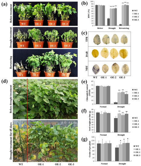 Phenotypic and physiological analyses of WT plants and lncRNA77580-OE transgenic soybean under drought stress in growth chambers (a–c) vs. the field (d–g). (a) Phenotypes of overall plants and (b) relative water content and (c) trypan blue, DAB, and NBT staining of the leaves of the WT plants and lncRNA77580-OE transgenic soybean grown under drought treatment or well-watered conditions. (d) Phenotypes of overall plants and (e) chlorophyll content, (f) seed weight per line, and (g) seed number per plant of the WT plants and lncRNA77580-OE transgenic soybean grown under drought treatment or in a well-watered field. Data are shown as the mean ± standard deviation (n = 3). Significant differences based on ANOVA were set at p < 0.05 (*) and p < 0.01 (**).