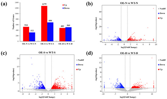 DEGs of soybean seedlings overexpressing lncRNA77580 under normal, salt, and drought conditions. (a) Numbers of up- and downregulated DEGs in lncRNA77580-overexpressing soybean (OE) under normal (N), salt (S), and drought (D) conditions. (b–d) Volcano diagrams of DEGs in lncRNA77580-overexpression soybean under normal, salt, and drought conditions compared with wild-type (WT) soybean. Blue spots represent DEGs whose expression was less than half that of the level in WT. Red spots represent DEGs whose expression was more than double that of the level in WT.