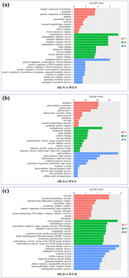 Gene Ontology analysis of the differentially expressed genes and their associated terms in molecular functions (MF), cellular components (CC), and biological processes (BP). (a–c) GO enrichment analysis of DEGs in lncRNA77580-OE soybean compared with WT under normal (N), salt (S), and drought (D) conditions.
