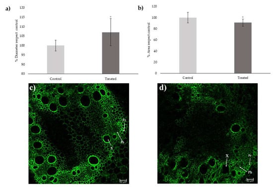 Treatment with the ED50 of trans-cinnamic caused alterations in the treated roots’ measured parameters (Figure 1c,d). The compound caused a significant increase of 7% compared to control in the diameter of the vascular cylinder (Figure 1a), although the area of the xylem vessels was significantly reduced by 9% compared to control in the treated roots (Figure 1b).