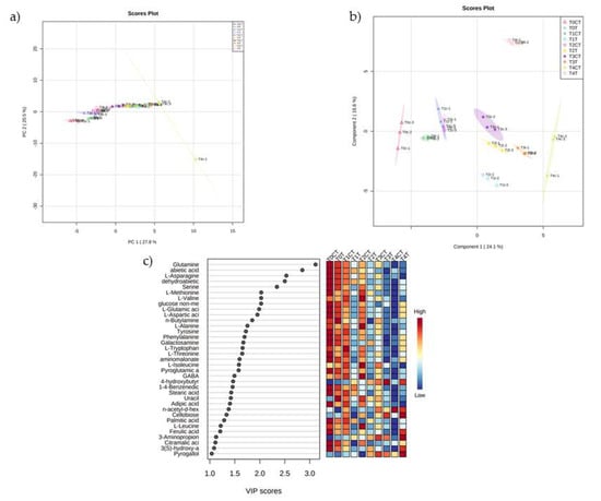 PLS-DA derived variable importance of projection (VIP) scores (built on the metabolites with a VIP score higher than 1.4) (Figure 2c) revealed that glutamine, abietic acid, L-asparagine, dehydroabietic acid, serine, L-methionine, L-valine, glucose, L-glutamic acid, L-aspartic acid, n-butylamine, L-alanine, tyrosine, phenylalanine, galactosamine, L-tryptophan, L-threonine, aminomalonate, L-isoleucine, pyroglutamic acid, gamma-aminobutyric acid (GABA), 4-hydroxybutyric acid, 1-4-benzenedicarboxylic acid, stearic acid, uracil, and adipic acid were the metabolites that were mainly contributing to groups discrimination (Figure 3).