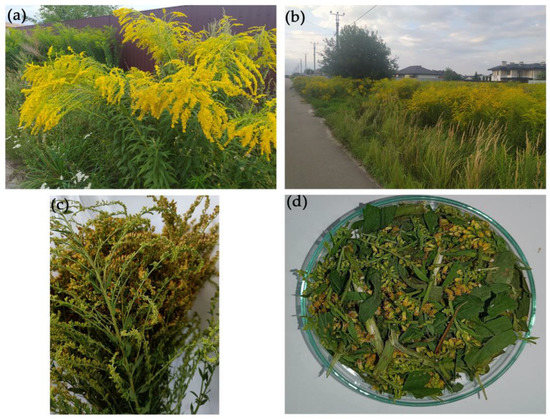 The spread of Solidago canadensis L. in the Sofiivska Borshchahivka village (a,b), Kyiv region, Ukraine) and drying (c) and the grinding (d) of plants for anaerobic degradation.