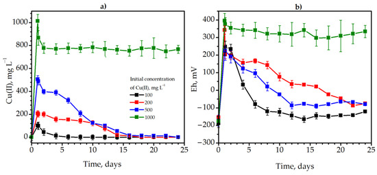 The dynamics of the Cu(II) detoxification (a) and Eh (b) during methane degradation of Solidago canadensis L. weed at the presence of 100 (black lines), 200 (red lines), 500 (blue lines), and 1000 (green lines) mg L−1 Cu(II): The black lines represent the value of the redox potential.
