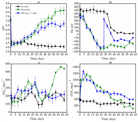 The high metabolic activity of MPB and CRB was confirmed by the dynamics of DOC. The hydrolysis of plant polymers took place during the first few days, which was evidenced by an increase in the DOC concentration from 427.8 to 999.8 mg L−1 after one day of degradation. In contrast to this variant, no changes in DOC were observed in the control. The DOC consumption slowed down after the insertion of copper (Figure 3d). Ammonium ions accumulated very intensively in the variant with methanogens and sulfate reducers, starting from the 40th day of fermentation. Thus, the concentration of ammonium ions increased from 188.0 to 564.3 mg L−1. The concentration of ammonium ions remained approximately at a constant level in the control and under the influence of copper (Figure 3c). Thus, in the control conditions, the reason for inefficient fermentation was the lack of a specific inoculum substrate. In the variant with copper, the metabolic parameters stabilized immediately after detoxification in the solution.