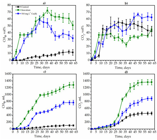 For 58 days of Solidago degradation, the maximum concentration of CH4 was 12.3 vol%. In contrast to the control conditions, in the version with the inoculum, the concentration of methane was extremely high and even reached 72.4 vol% on the 36th day of degradation. The concentration of CH4 decreased significantly after the addition of Cu(II) (Figure 4a, blue lines), but remained higher than in metal-free control conditions (Figure 3a, black lines). Thus, the maximum concentration of CH4 in the variant with copper was 58.6 vol% (Figure 4a, blue lines).