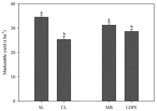 Marketable yields of muskmelon affected by soil texture (clay–loam—CL; sandy loam—SL) and mulching (biodegradable film—MB; polyethylene—PE). The vertical bars show the standard error; different letters indicate statistical differences.