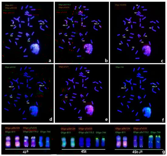 Sequential ND-FISH patterns of wheat-Th. intermedium double substitution line, X479. The probes for FISH are: (a) Oligo-B11 (green) and Oligo-pDb12H (red); (b) Oligo-pSc119.2 (green) and Oligo-pTa535 (red), (c) Oligo-5SrDNA; (d) Oligo-pSt122; (e) Oligo-pTa71; and (f) Oligo-744 (green). The karyotype of the 4JS, 4St and 4St-JS chromosomes are shown using the probe combinations Oligo-B11 with Oligo-pDb12H (left), Oligo-pSc119.2 and Oligo-pTa535 (middle), and Oligo-744 (right), respectively (g).