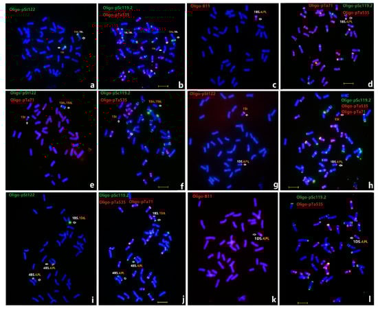 - Tang, S.; Tang, Z.; Qiu, L.; Yang, Z.; Li, G.; Lang, T.; Zhu, W.; Zhang, J.; Fu, S. Developing new oligo probes to distinguish specific chromosomal segments and the A, B, D genomes of wheat (Triticum aestivum L.) using ND-FISH. Front. Plant Sci. 2018, 9, 1104. [Google Scholar] [CrossRef]