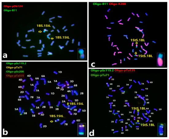 Sequential ND-FISH patterns showing wheat-Th. intermedium homozygous 1St translocation lines. (a,b) 1BS.1StL and (c,d) 1BL.1StS. The probes for FISH were: (a) Oligo-B11 (green) with Oligo-pDb12H (red); (b) Oligo-pSc119.2 (green) with Oligo-pTa535 (red); (c) Oligo-k288 (red) with Oligo-D (green); and (d) Oligo-pSc119.2 (green) with Oligo-pTa535 (red). The arrows indicated the translocation chromosomes.