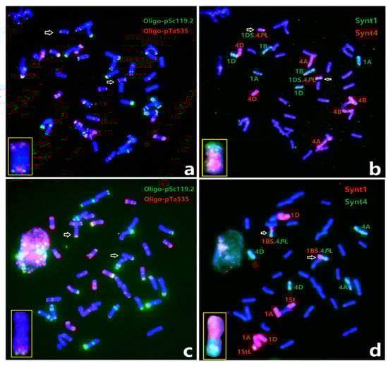 Sequential ND-FISH and Oligo-FISH painting of wheat-4JSL translocation lines, (a,b) 1DS.4JSL and (c,d) 1BS.4JSL, using the ND-FISH probes (a,c) Oligo-pSc119.2 with Oligo-pTa535 and Oligo-FISH painting probes (b,d) Synt1 and Synt4, respectively. The chromosomes indicated with arrows are extracted and put in the boxes to indicate the translocated chromosomes.