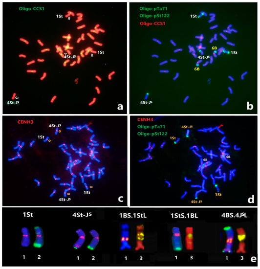 The CENH3 is an essential component of the kinetochore complex of active centromeres, and the mitotic interphase cells are ideal for demonstrating co-localization of CENH3 and centromere repetitive DNA sequences, although the centromere repeats may change extremely rapidly [41,42]. In wheat-alien interspecific hybridization, the wheat-Thinopyrum partial amphiploids containing typical centromeric repeats were well co-localized with CENH3 [43]. In the present study, the substitution line X479 displayed chromosomal distribution of CENH3 in wheat and the CENH3 peptide generated distinct signals in the centromeric regions of 1St and 4St-JS chromosomes (Figure 5a,c), as well as the progenies with 1StS.1BL, 1BS.1StL and 4BS.4JSL, which were detected using immunostaining experiments (Figure 5e). The observed CENH3 signals were co-localized with Oligo-CCS1 signals in wheat with roughly identical densities, although the Oligo-CCS1 repeats in the wheat A, B and D genome showed with divergent copies [28]. It is likely that centromere-associated DNA sequences are not fixed but are dynamic in their amounts and positions on chromosomes in Triticeae. Further studies will be performed to reveal the Thinopyrum-derived centromere incorporated CENH3 of wheat in the wheat-1St or wheat-4JSL hybrid centromere, as well as the mechanism of wheat-Thinopyrum translocated chromosomes for maintaining their chromosome stability with respect to evolutionary and breeding purposes [44,45].