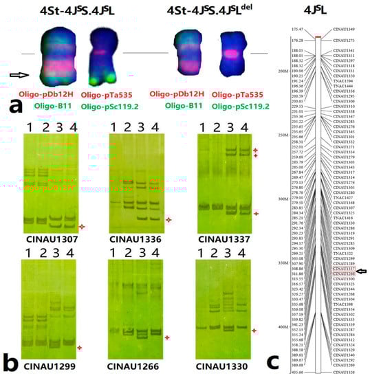 The Oligo-pDb12H sequences were used for BLAST searching of the Thinopyrum intermedium reference genome sequences v2.1 by B2DSC web sites [28]. The JS chromosomes in the reference genome were determined by the distribution of Oligo-pDb12H (Figure S2), and consequently predicted to have 2074–4868 copies of Oligo-pDb12H, and chromosome 4JS (the chromosome 12 or 4JVS of Cseh et al. [29]) had 2592 copies. The result is consistent with the ND-FISH study, which indicated the level of the enrichment of Oligo-pDb12H sites in the JS-chromosomes. A total of 55 4VL-specific CINAU markers (Table S2) [30] were physically localized on 176–435Mb of Thinopyrum intermedium V2.1, as shown in Figure 6. A line M931 was identified to have a pair of 4St-4JS deletion chromosomes, and ND-FISH results indicated that M931 had lost the Oligo-B11 signals in the long arm of the 4JSL, with the break point estimated about FL0.6 of 4JSL (Figure S3). The DNA of the lines CS, MY11, X479 and M931 was used to assign the markers onto the deletion chromosomes in line M931. As indicated in Figure 6c, the CINAU1337 was located at 308.86 Mb, and proximal markers on the centromeric region were present in M931, but CINAU1266 located at 311.86 Mb distal to the telomeric regions was amplified only in X479. Therefore, the estimated physical position of FL0.6 of 4JSL in M931 may be localized between the 308.86 to 311.86 Mb genomic region of 4JS (Figure 6).