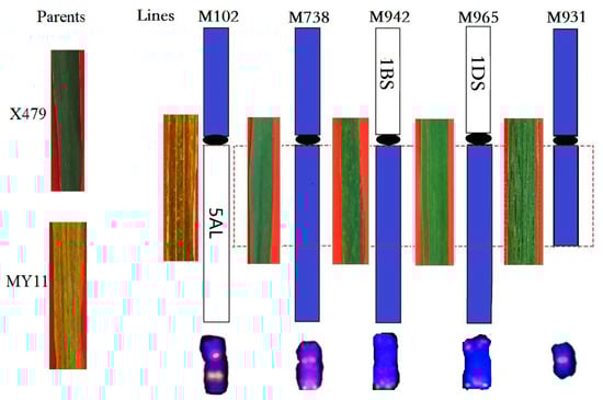 In order to evaluate the contribution of the two wheat-Th. intermedium translocated chromosomes to agronomic characteristics in the progeny of X479 and MY11, the resistance responses of each plant to stripe rust were observed among the plants karyotypically identified with ND-FISH. Infection type responses of X479 and its derived progenies were measured at the adult plant stages in the field. As shown in Figure 7, X479 was highly resistant to stripe rust (IT = 0), while MY11 was highly susceptible (IT = 4). Among its derived progenies, plants with the different translocation chromosomes 1BS.4JSL (M942) and 1DS.4JSL (M965), and the 4St-JS deletion (M931) showed high resistance (including some plants with hypersensitive reactions after rust inoculation, IT = 0 to 0;). The plant M102 containing only the 4JSS translocation (4St-4JSS.5AL) was susceptible to the rust races (Figure 7). These results indicate that the stripe rust resistance was from the Th. intermedium and may be physically localized on FL0–0.60 of 4JSL.