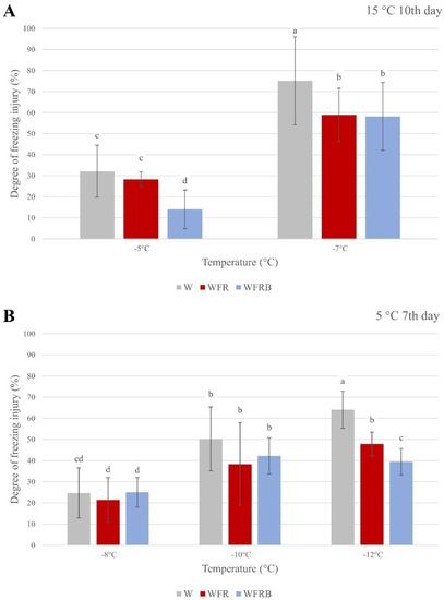 The effects of the supplementary far-red and blue light treatments on freezing tolerance under various temperatures. The X−axis shows the freezing temperatures, whereas the Y−axis refers to the relative conductance values (percentage of lethality). The plantlets were grown under a 12 h photoperiod. W: white light, WFR: far-red-enriched white light, WFRB: far-red- and blue-enriched white light. In each case, the samples were collected on the last day of the treatments. (A) 10th day at 15 °C temperature; (B) 7th day at 5 °C. The data and error bars, which represent the standard deviation, originated from three biological replicates. Statistical analysis was performed with Kruskal−Wallis test. Values indicated with different letters are significantly different from each other at p ≤ 0.05 levels.