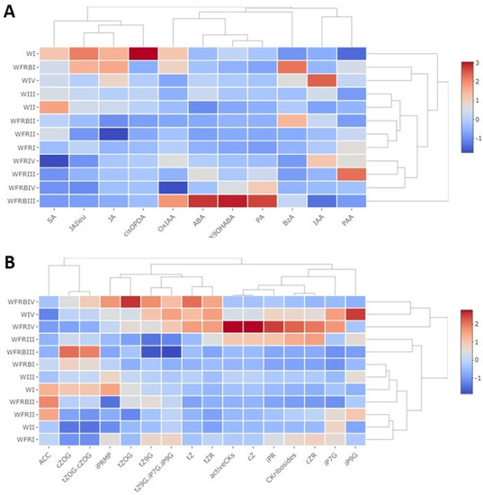 The effect of supplementary FR and Blue light at normal and low temperature on hormone concentrations. Leaf samples were collected six to eight hours after the start of illumination. The plantlets were grown under a 12 h photoperiod. (A) fraction A, eluted with methanol containing ABA, IAA, SA, and JA; (B) fraction B, eluted with 0.35 M NH4OH in 60% methanol containing CKs. W: white light, WFR: far-red-enriched white light, WFRB: far-red and blue-enriched white light. I−1 day at 15 °C, II−10 days at 15 °C, III−1 day at 5 °C, IV−15 days at 5 °C. The data originated from three to five biological replicates. The values on the X and Y axis outside of the heat map refer to the distance or proximity of data after hierarchical clustering.