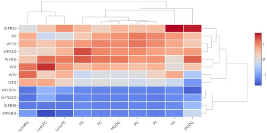 All experimental variants differing in temperature or sampling time in relation to the WFRB treatment are clearly classified into a distinct cluster. There was always a decreasing trend in the measured lipid classes compared to W. In the case of WFR treatment the exact opposite effect was found. Lysophosphatidyl lipids, which are primarily precursors of PC and PE [14], were clustered in a well-differentiated group in terms of individual lipid classes. A significant decrease in the total LPC content could be observed not only in WFRB light but also after FR supplementation, which mainly occurred after the temperature drop. According to the total LPE content, the amount of lipids changed significantly after ten days, primarily in the case of WFR and WFRB treatments. We can see a significant decrease in the WFR treatment at 5 °C, which was strengthened by WFRB light.