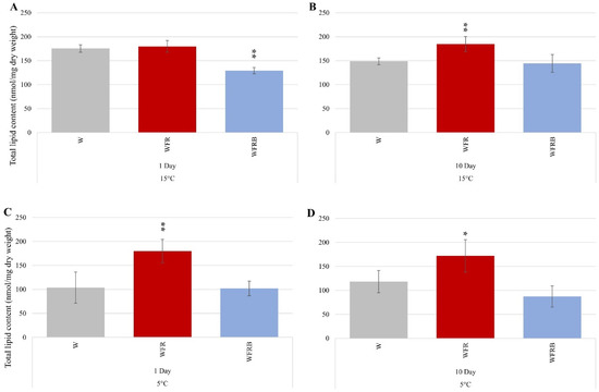 Figure 4 shows the total lipid content determined by relating the signal value to dry weight. It could be seen that light quality had a remarkable effect on total lipid content. As a result of WFR illumination, the total lipid content increased, both on the tenth day of the 15 °C treatment, and on the first and seventh days at 5 °C. Under WFRB illumination, the total lipid content decreased regardless of the temperature.