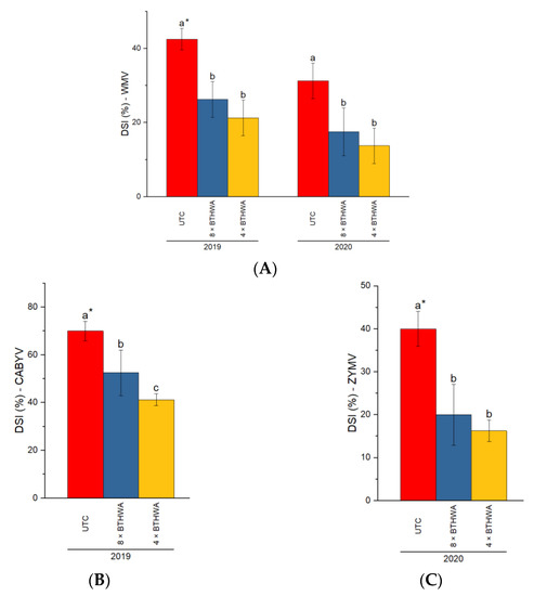 The Disease Severity Index (DSI%) for zucchini (Cucurbita pepo convar. giromontiina) infected with WMV (A), CABYV (B), and ZYMV (C). Statistical differences appeared between the plants subjected to different variants of treatments in respective years (treatment × years). * means followed by different letters indicates a statistically significant difference at p < 0.05 according to Tukey’s HSD (n = 4). UTC—Untreated Control plants that were not treated with BTHWA, 8 × BTHWA—plants that were treated with BTHWA eight times, 4 × BTHWA—plants that were treated with BTHWA four times.