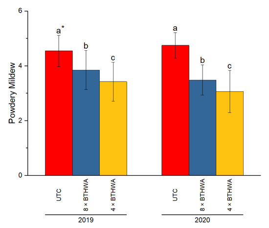 The powdery mildew disease incidence in zucchini (Cucurbita pepo convar. giromontiina) was treated in two variants with BTHWA in 2019 and 2020. Significant differences found between the results for the plants treated in the same variant in respective years (treatments × years), * means followed by different letters indicate significant difference at p < 0.05 according to Tukey’s HSD (n = 20). UTC—Untreated Control plants that were not treated with BTHWA, 8 × BTHWA—plants that were treated with BTHWA eight times, 4 × BTHWA—plants that were treated with BTHWA four times.