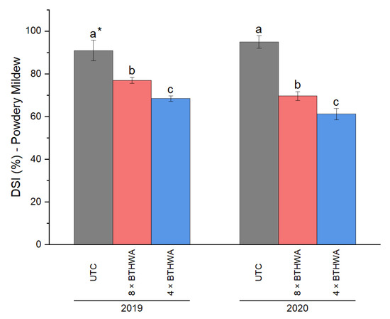 Similarly, as for viral pathogens, the DSI for powdery mildew was also calculated. The DSI for powdery mildew were fully consistent with the previously reported results of scoring powdery mildew incidence. According to the DSI values, the disease severity for the plants of UTC was significantly higher than that of 8 × BTHWA-treated plants and 4 × BTHWA-treated ones (Figure 4). The disease severity was lowered as a result of BTHWA application, and the lowest powdery mildew DSI was noted in the 4 × BTHWA-treated plants.