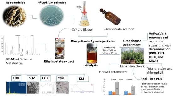 The current study aimed to isolate and identify a Rhizobium strain from faba bean plants and use its culture filtrate to biosynthesize AgNPs. Additionally, we aimed to characterize the biosynthesized AgNPs and evaluate their efficiency in controlling BYMV infection in faba bean plants in the greenhouse, including estimating physiological and growth parameters and quantifying POX and PPO enzymes and non-enzymatic oxidative stress marker (H2O2 and MDA) kinetics. Moreover, we intended to measure the expression levels of pathogen-related protein 1 (PR-1) and hydroxycinnamoyl-CoA quinate hydroxycinnamoyl transferase (HQT) genes. Additionally, we aimed to detect the bioactive compounds in the used culture filtrate using GC-MS.