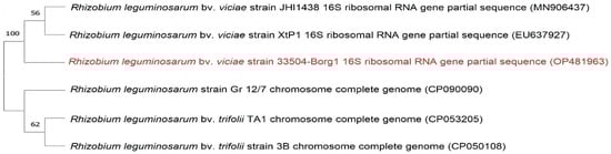 The 16S rRNA phylogenetic tree based on the sequences of Rhizobia isolates retrieved from the GenBank website and aligned with the Egyptian isolate R. leguminosarum bv. viciae strain 33504-Borg1 (OP481963).