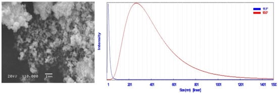 In this study, the color, form, and size of the AgNPs biosynthesized by the supernatant of R. leguminosarum bv. viciae were validated by visual inspection (observing the color changing to yellowish brown after 96 h of incubation (Figure S1)) and scanning electron microscope (SEM) examination. The AgNPs were spherical in form, with rough surfaces (Figure 3). The dynamic light scattering (DLS) analysis showed that the biosynthesized AgNPs in the aqueous medium had a particle size distribution of 13.7 nm (Figure 3).