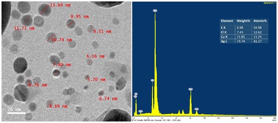 Transmission electron microscopy (TEM) was used to characterize the nanoparticles’ size, distribution, and shape in great detail. The TEM analysis showed that the AgNPs were mono-dispersed and sphere-shaped, and that the size of the AgNPs varied from 5.70 nm to 13.69 nm (Figure 4). In addition, EDX spectra analysis results validated the presence of elemental Ag, C, Cl, and Cu in the analytical samples. A strong absorption peak appeared at about 3 KeV, confirming the metallic silver nanoparticles’ exitance (Figure 4).